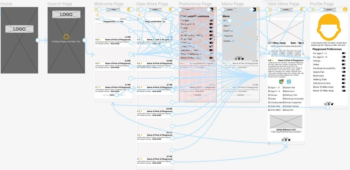 After ideating and completing some paper wireframes I created a digital wireframe that has the ability to be the initial design of the Hop Skip Jump App. This looks to guide users to find the perfect playground for the little ones they love.