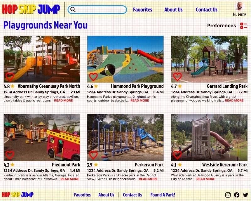 Hop Skip Jump looking to fulfill the users experience with finding playgrounds near them. Many of the users showed concerns about having kids that may be smaller or of different ages and want to be able to find playgrounds that fit their children's needs. Another concern that was shown was safety of the park and the environment that the playgrounds are located in. Hop Skip Jump looks to focus on these thing to give users a better experience that they will never forget and would like to continue to use, either locally, or on the go.