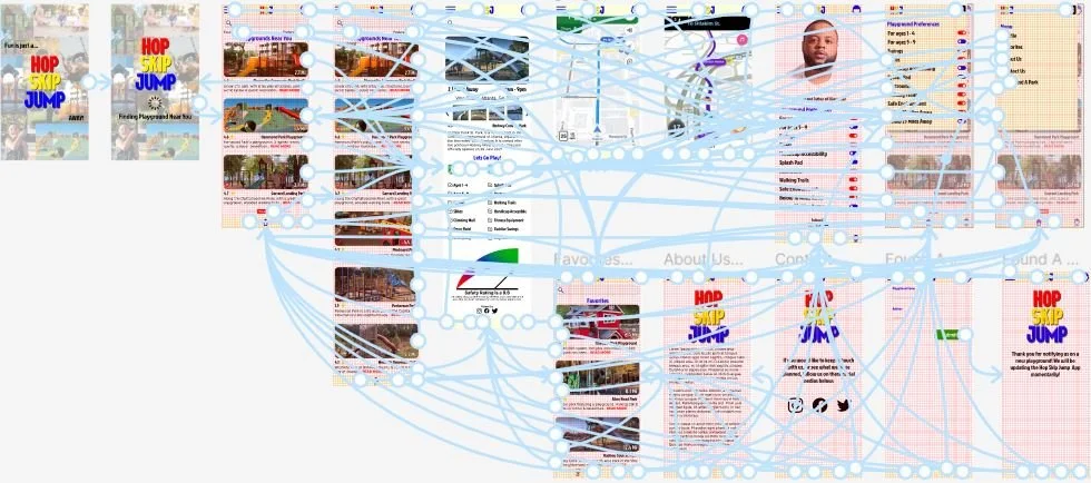 The high fidelity prototype has the same user flow as the low fidelity prototype, but with a few added pages to expand the experience and design changes made about the usability study. | View: Hop Skip Jump High-Fidelity Prototype